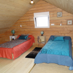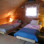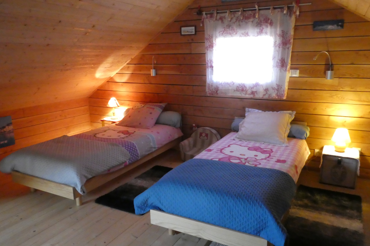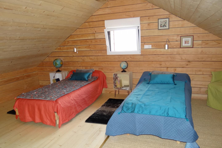À l'étage : 1 chambre ouverte en mezzanine avec 2 lits de 90, + lit bébé.