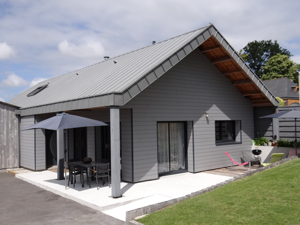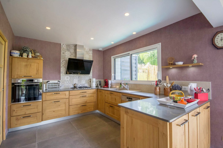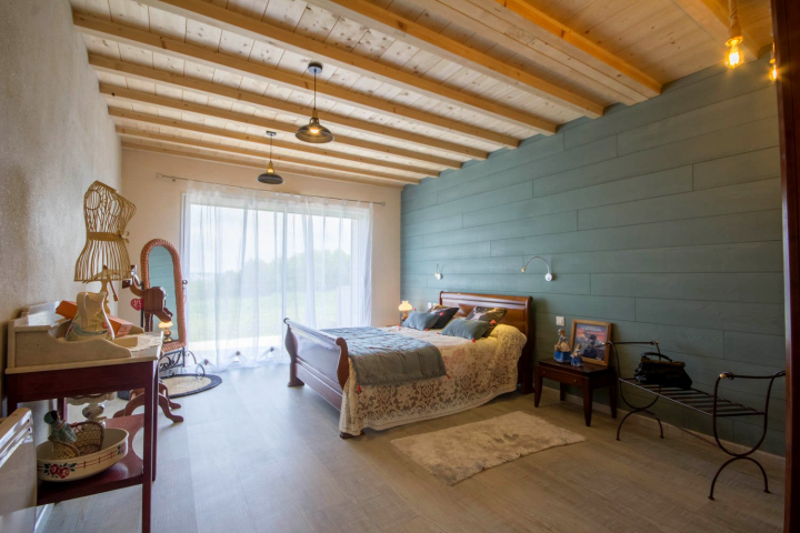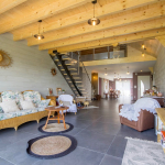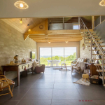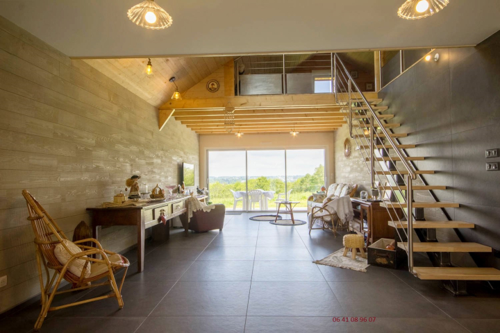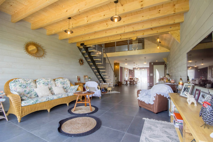 Au rez-de-chaussée : grande pièce de vie traversante de 75 m². Une chambre de 20 m² avec 1 lit 2 pers. Cuisine équipée, Buanderie